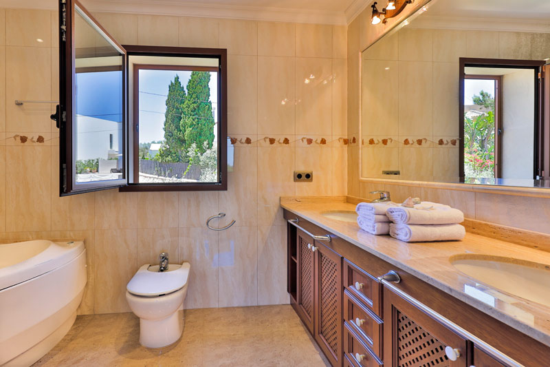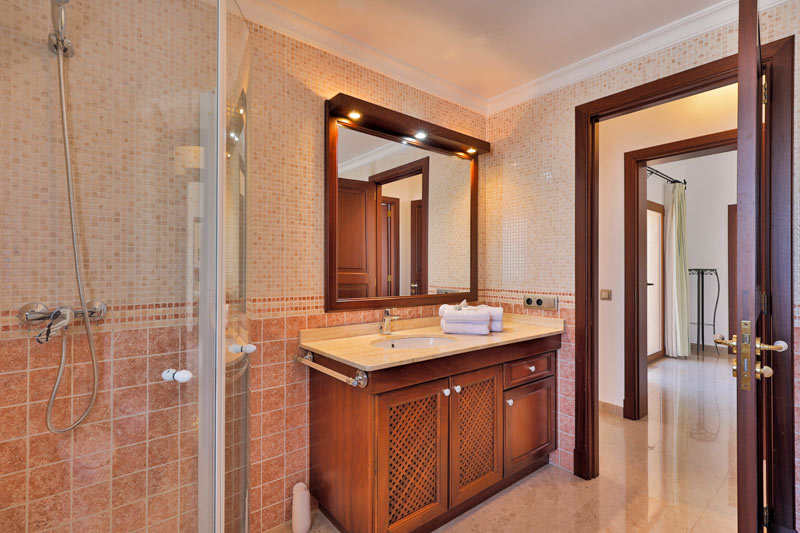 | Neben dem bereits erwähnten Ensuite Bad im Erdgeschoss gibt es in der oberen Etage 2 weitere Badezimmer. Eines liegt ebenfalls ensuite zu einem der Schlafzimmer und ist mit Badewanne, Waschtisch, Bidet und WC ausgestattet. Das andere Bad verfügt über Dusche, Waschbecken und WC. |