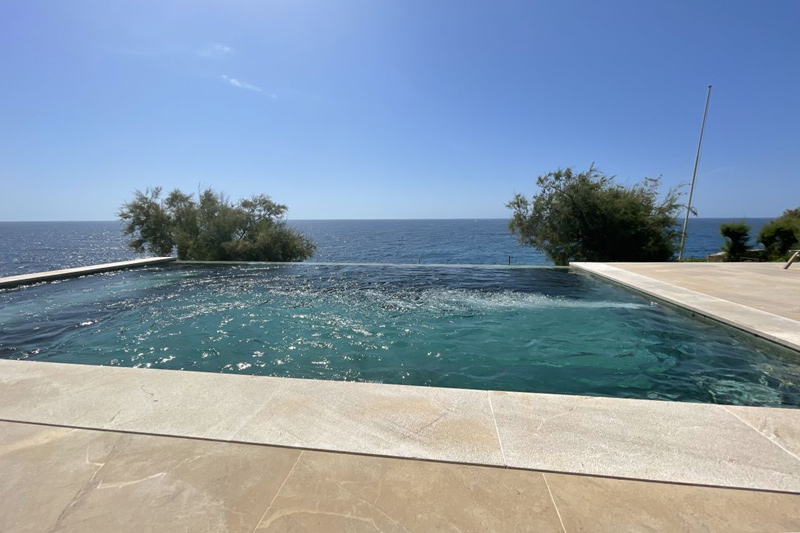 | Auf der Poolterrasse erwarten Sie Sonnenliegen, auf denen Sie es sich mit Blick auf das Meer gemütlich machen können. Der Pool ist ca. 9 x 5 m groß und bietet sich nach ausgiebigen Sonnenbädern für willkommene Erfrischungen an. Die Gegenstromanlage ermöglicht auch sportliche Aktivitäten und im Anschluss sorgen die Massagedüsen für Entspannung. Es stehen auch Sonnenschirme bereit, die bei Bedarf Schatten spenden. |
