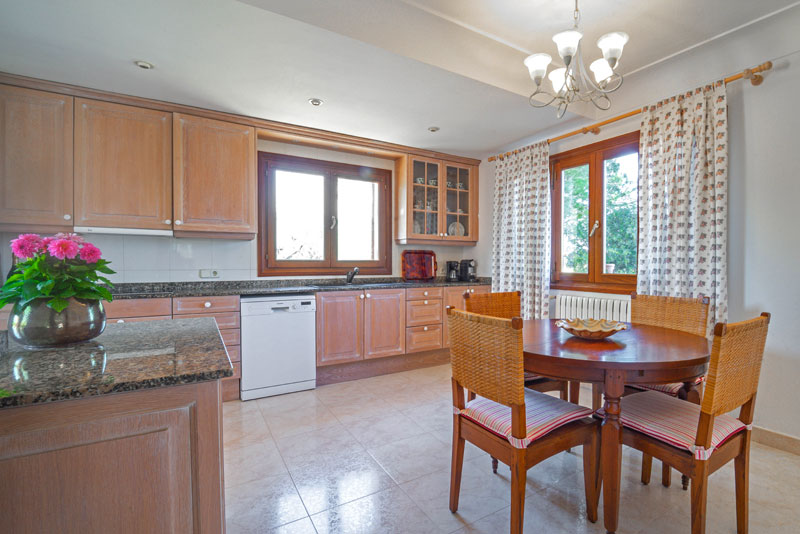 | Gleich neben dem Esszimmer befindet sich die vollausgestattete Küche. Cerankochfeld, Backofen, Mikrowelle, Kühl-Gefrierschrank, Spülmaschine, Kaffeemaschine (Filter und Kapsel) und Toaster sind ebenso vorhanden wie Kochutensilien und Geschirr. Einer optimalen Selbstversorgung steht also nichts im Wege. Die Waschmaschine, ein Wäschetrockner sowie ein Bügelset sind in einem separaten Hauswirtschaftsraum untergebracht. |
