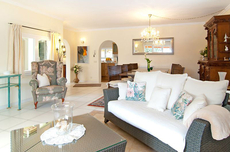 | Das Ferienhaus verfügt auf ca. 180 qm Wohnfläche über einen großzügigen Wohn-Essbereich, eine Küche, 3 Schlafzimmer und 2 Bäder. Alle Zimmer sind mit Zentralheizung ausgestattet. Auch ein Safe und ein Kinderbett gehören zum Inventar. Von der Poolterrasse aus gelangen Sie in den Wohnbereich mit absoluter Wohlfühlatmosphäre. Helle Polstermöbel und Stoffe harmonieren hier mit dunklen Holzmöbeln. |