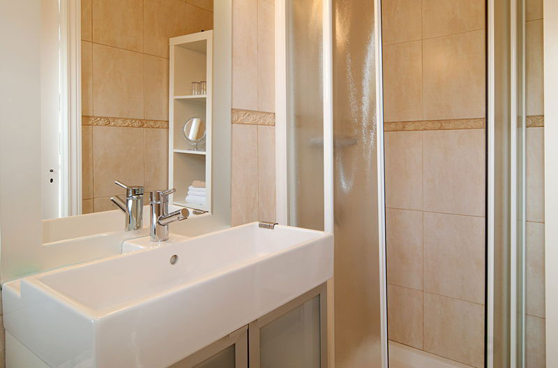 | Im Erdgeschoss befinden sich zwei Schlafzimmer mit Doppelbetten (1,80 x 2,00 m) und TV. Diese Schlafzimmer teilen sich ein modernes Badezimmer mit Badewanne. In der ersten Etage befindet sich das dritte Schlafzimmer. Es ist mit einem Doppelbett (1,80 x 2,00 m), Klimaanlage und Bad en Suite ausgestattet. Hier im Obergeschoss erreichen Sie auch die Meerblick-Terrassen des Ferienhauses. |